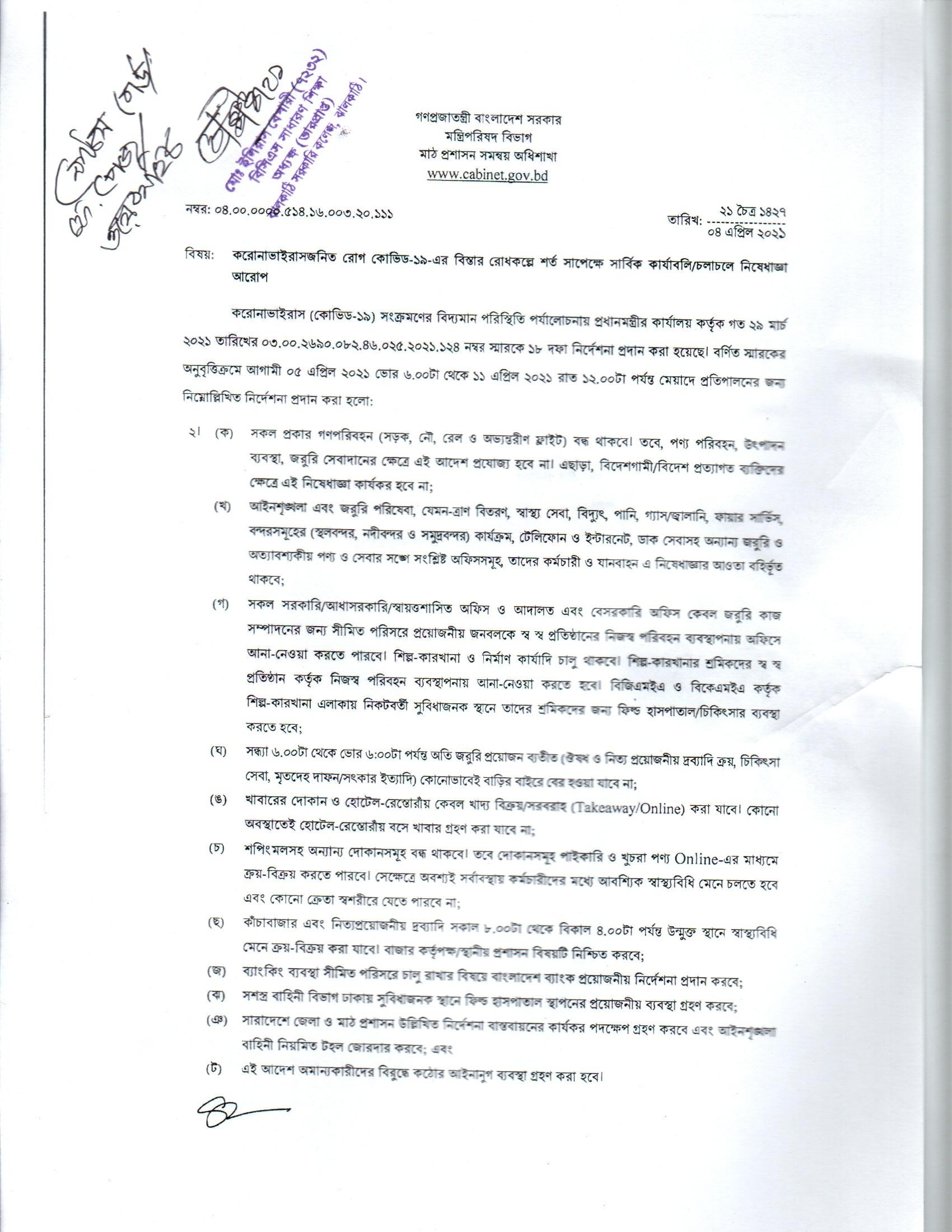 করোনাভাইরাসজনিত রোগ কোভিড-19 এর বিস্তার রোধকল্পে শর্ত সাপেক্ষে সার্বিক কার্যাবলি/চলাচলে নিষেধাজ্ঞা আরোপ প্রকাশিতঃ ৫ এপ্রিল , ২০২১, ১২:৫০ অপরাহ্ন Facebook Twitter Print Facebook Twitter Print