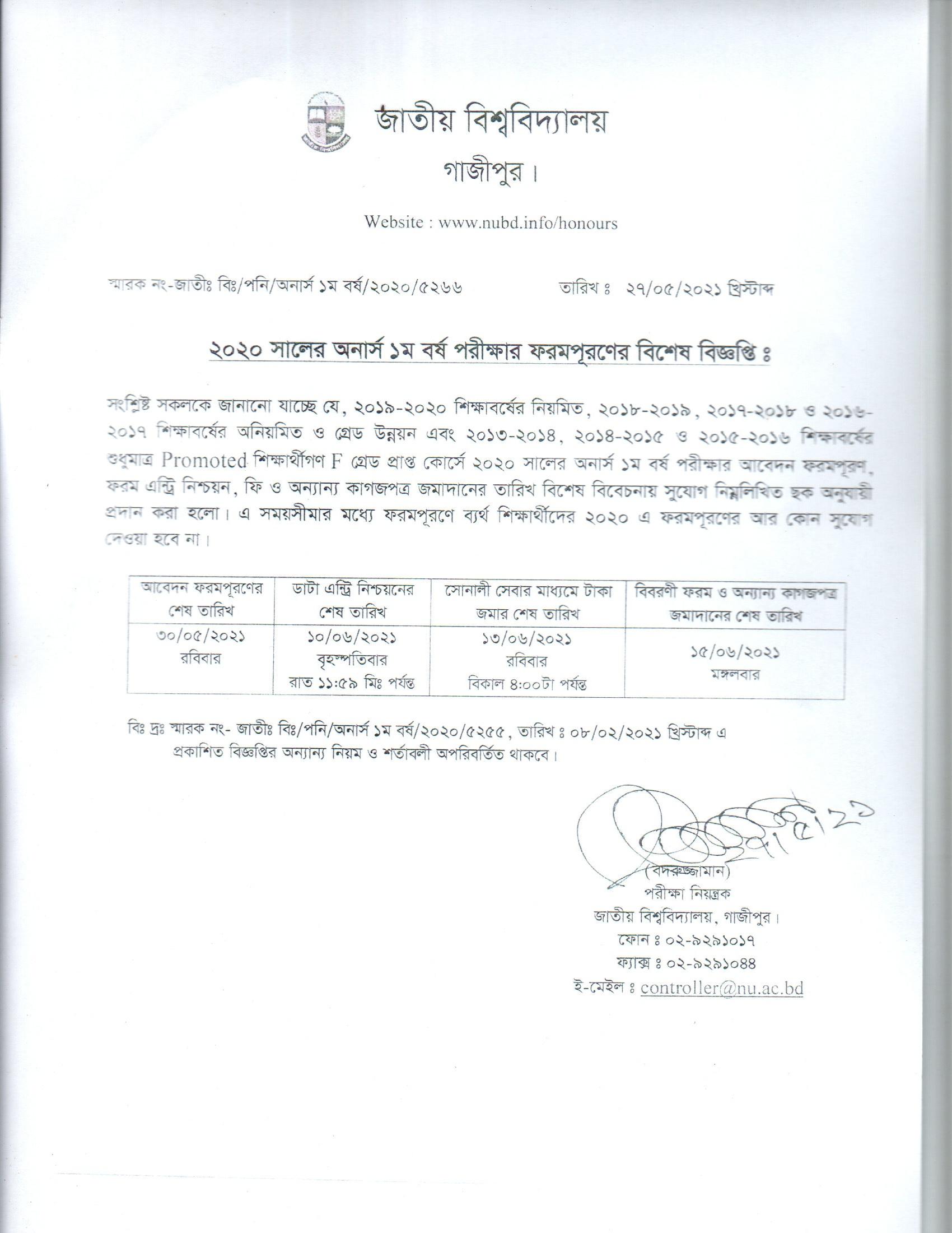 ২০২০ সালের অনার্স ১ম বর্ষ পরীক্ষার ফরমপূরণের বিশেষ বিজ্ঞপ্তি প্রকাশিতঃ ২৯ মে , ২০২১, ১১:৩৪ পূর্বাহ্ন Facebook Twitter Print Facebook Twitter Print