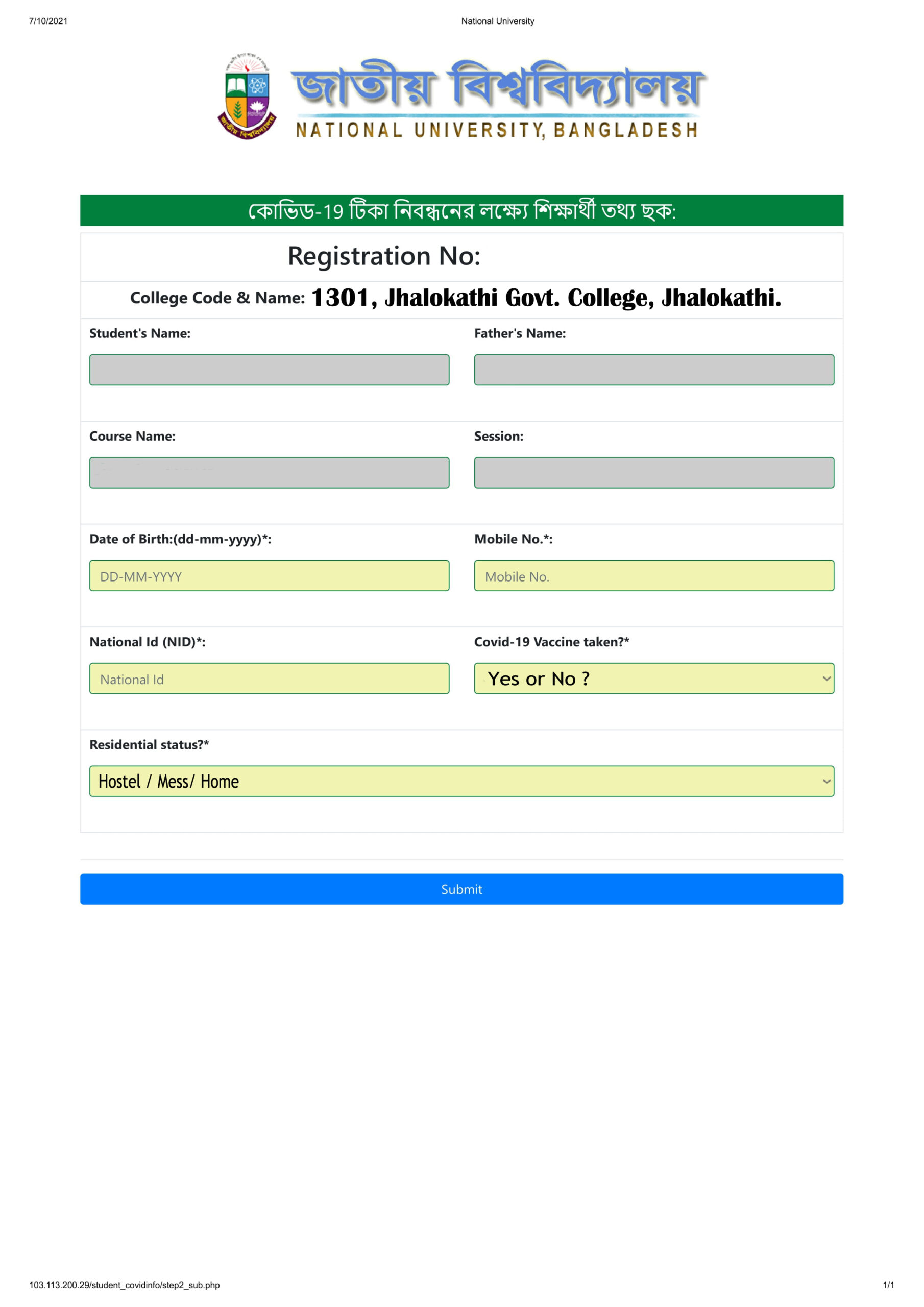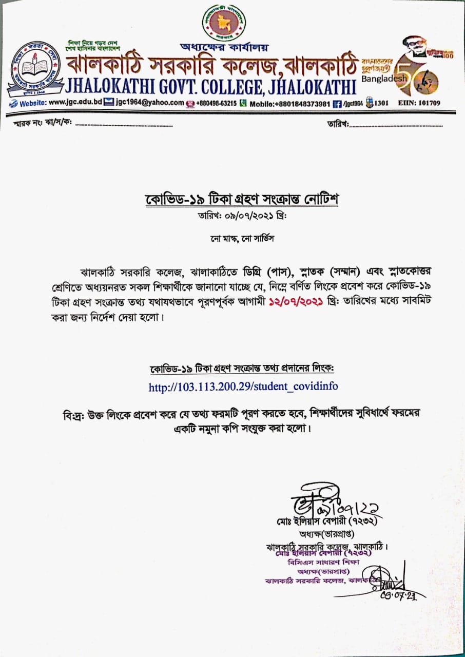 কোভিড-১৯ টিকা গ্রহণ সংক্রান্ত নোটিশঝালকাঠি সরকারি কলেজ, ঝালাকাঠিতে ডিগ্রি (পাস), স্নাতক (সম্মান) এবং স্নাতকোত্তর শ্রেণিতে অধ্যয়নরত সকল শিক্ষার্থীকে জানানো যাচ্ছে যে, নিন্মে বর্ণিত লিংকে প্রবেশ করে কোভিড-১৯ টিকা গ্রহণ সংক্রান্ত তথ্য যথাযথভাবে পূরণপূর্বক আগামী ১২/০৭/২০২১ খ্রি: তারিখের মধ্যে সাবমিট করা জন্য নির্দেশ দেয়া হলো।কোভিড-১৯ টিকা গ্রহণ সংক্রান্ত তথ্য প্রদানের লিংক নিন্মে নোটিশে দেয়া আছে।