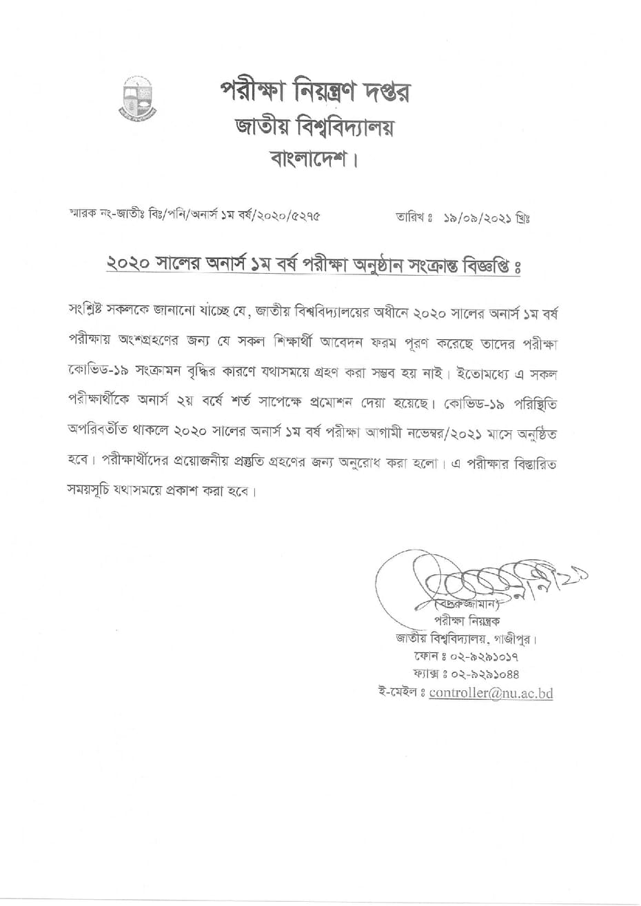 ২০২০ সালের অনার্স ১ম বর্ষ পরীক্ষা অনুষ্ঠান সংক্রান্ত বিজ্ঞপ্তি প্রকাশিতঃ ১৯ সেপ্টেম্বর , ২০২১, ৩:১৯ অপরাহ্ন Facebook Twitter Print Facebook Twitter Print