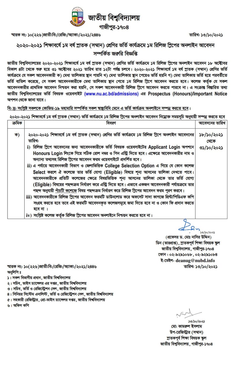 অনার্স ১ম বর্ষ (২০২০-২১ শিক্ষাবর্ষ) এর রিলিজ স্লিপে ভর্তির আবেদন বিজ্ঞপ্তি প্রকাশিতঃ ১৬ অক্টোবর , ২০২১, ১১:২১ পূর্বাহ্ন Facebook Twitter Print Facebook Twitter Print