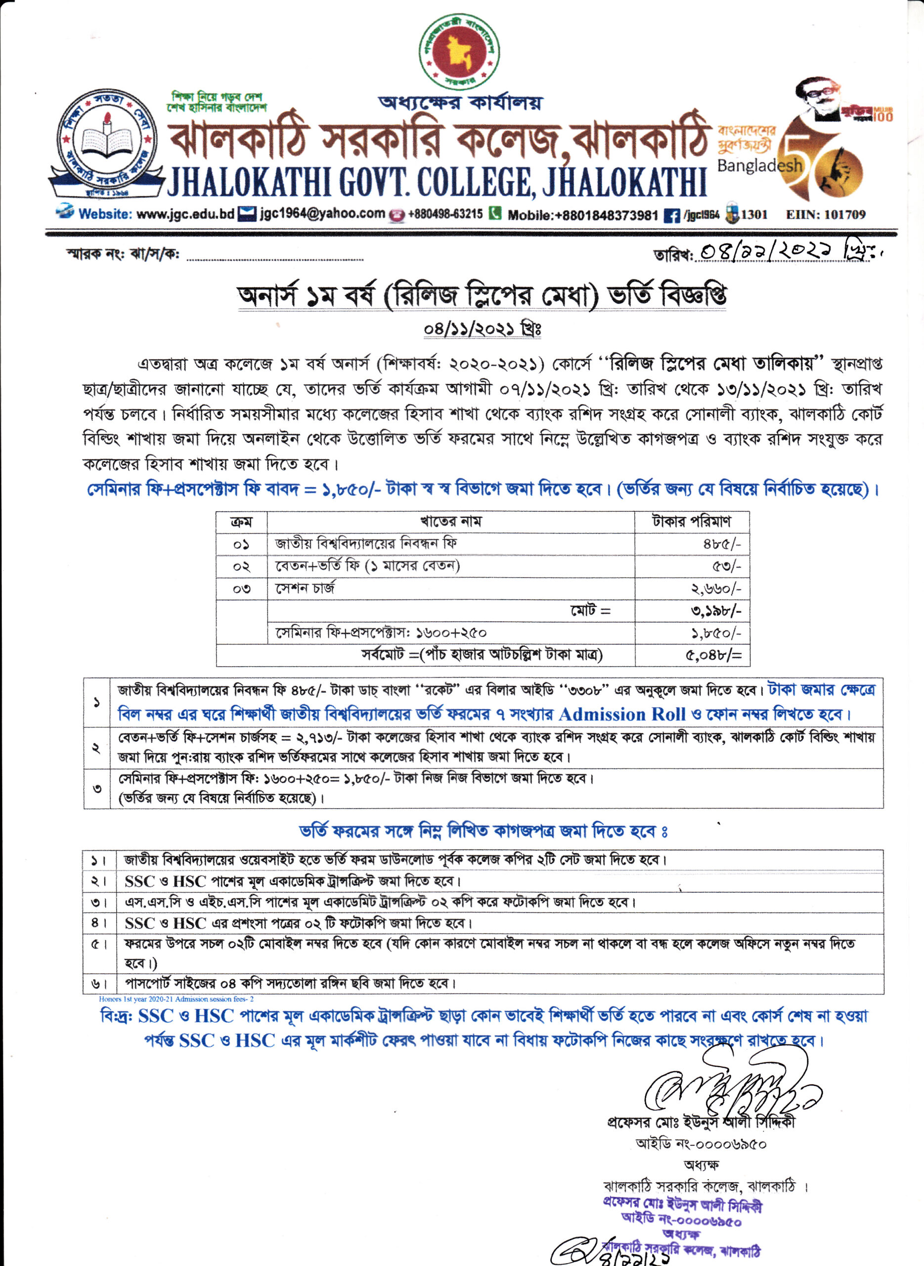অনার্স ১ম বর্ষ(২০২০-২১ শিক্ষাবর্ষ) এর ১ম রিলিজ স্লিপ মেধার ভর্তি বিজ্ঞপ্তি প্রকাশিতঃ ৪ নভেম্বর , ২০২১, ১০:৩৩ পূর্বাহ্ন Facebook Twitter Print Facebook Twitter Print