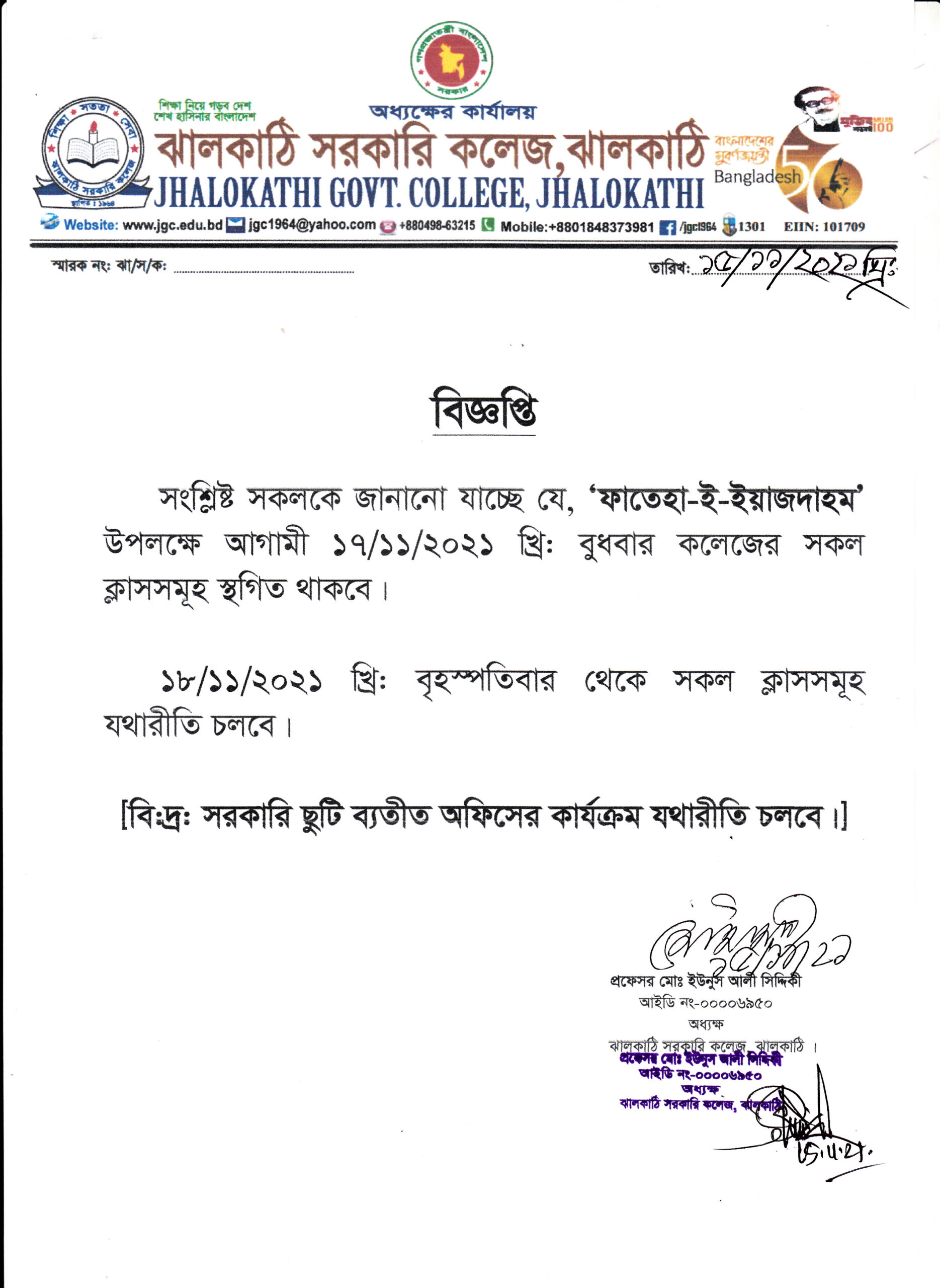 ফাতেহা-ই-ইয়াজদাহম উপলক্ষ্যে ১৭/১১/২১ তারিখ বুধবার কলেজের সকল ক্লাস স্থগিত প্রসঙ্গে। প্রকাশিতঃ ১৬ নভেম্বর , ২০২১, ১১:০৯ পূর্বাহ্ন Facebook Twitter Print Facebook Twitter Print