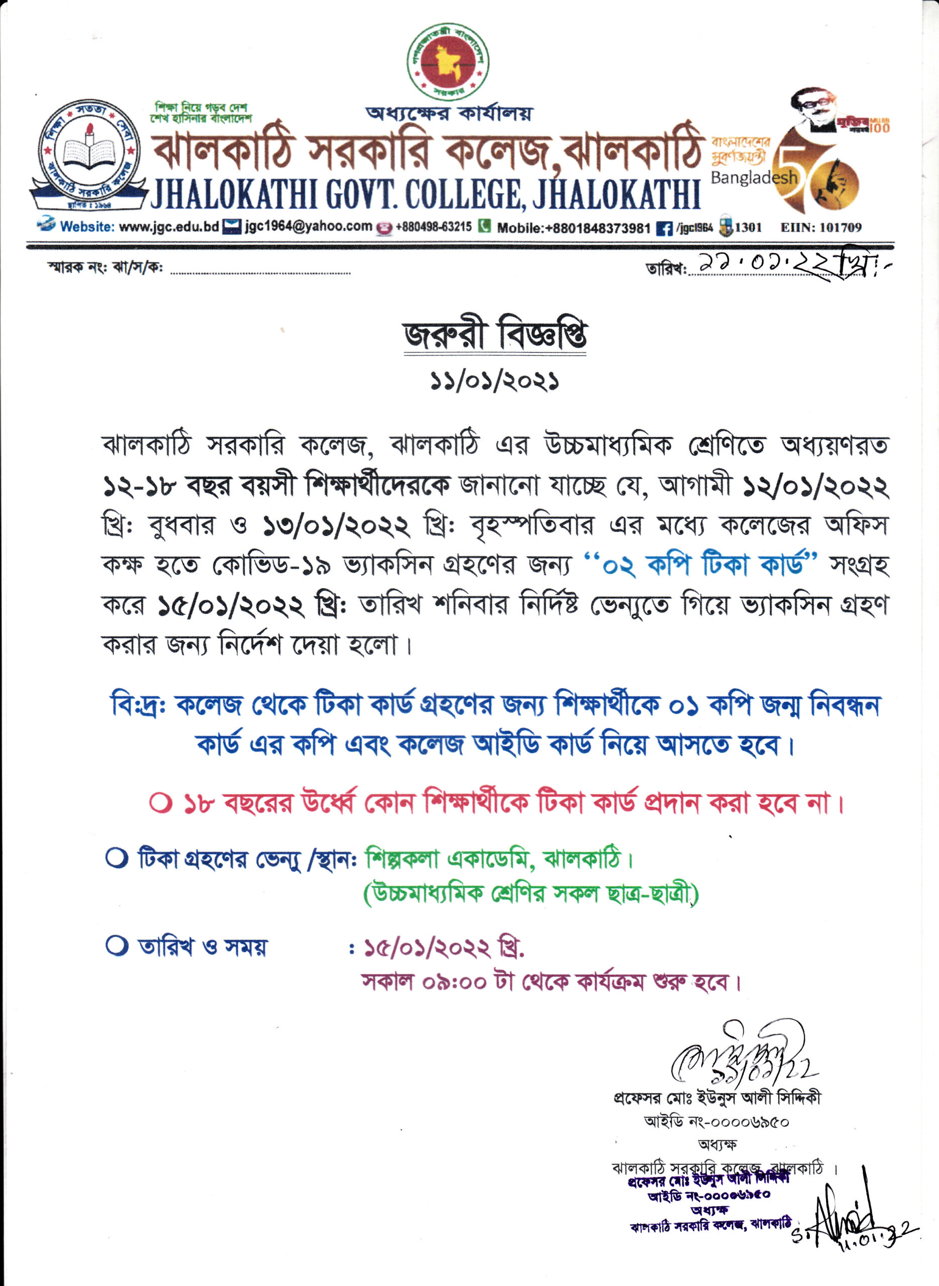 ১২-১৮ বছর বয়সী শিক্ষার্থীদের কোভিড-১৯ ভ্যাকসিন গ্রহণের লক্ষ্যে টিকা কার্ড বিতরণের বিজ্ঞপ্তি প্রকাশিতঃ ১১ জানুয়ারী , ২০২২, ১:১৮ অপরাহ্ন Facebook Twitter Print Facebook Twitter Print
