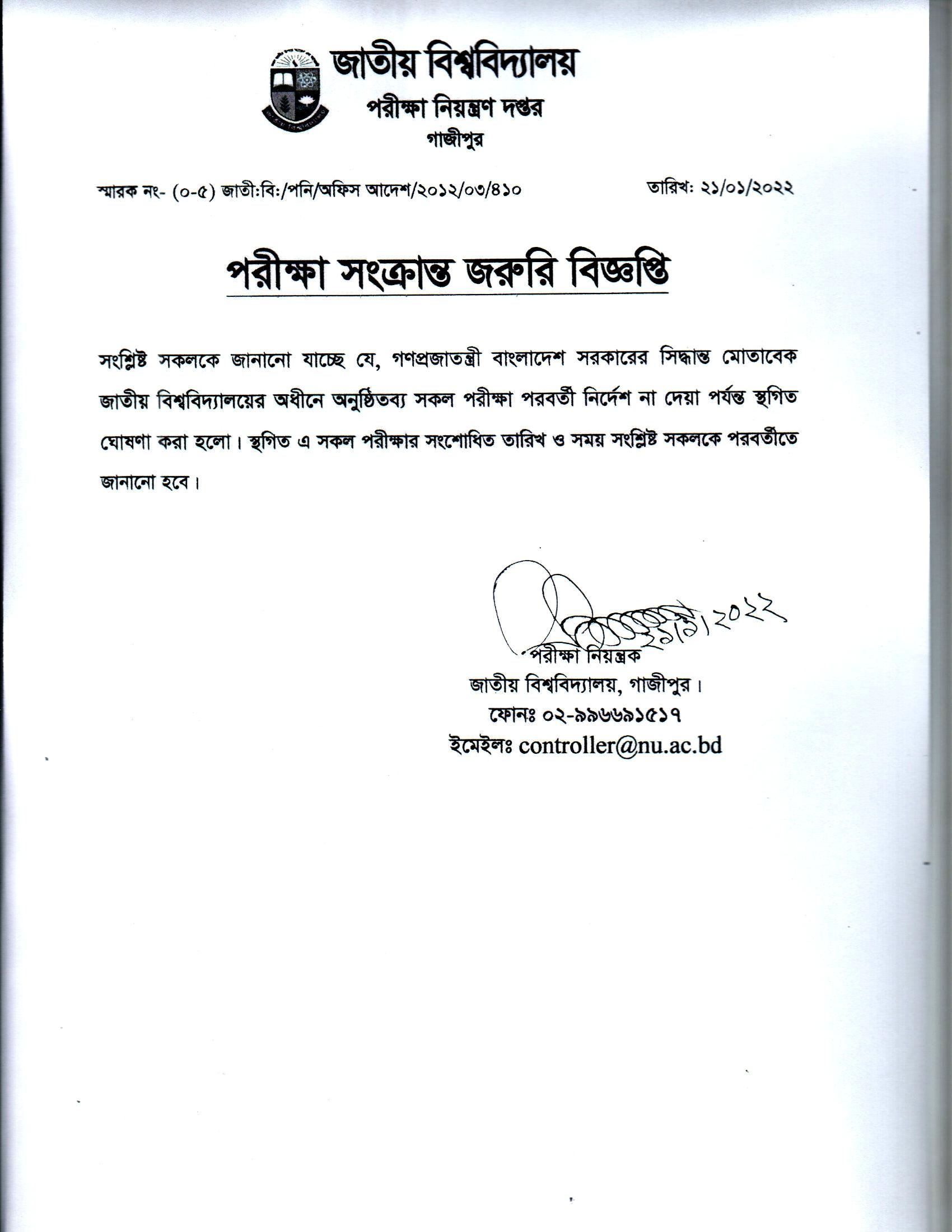 জাতীয় বিশ্ববিদ্যালয়ের অধীনে অনুষ্ঠিতব্য সকল পরীক্ষা স্থগিত সংক্রান্ত বিজ্ঞপ্তি প্রকাশিতঃ ২২ জানুয়ারী , ২০২২, ১১:০২ পূর্বাহ্ন Facebook Twitter Print Facebook Twitter Print