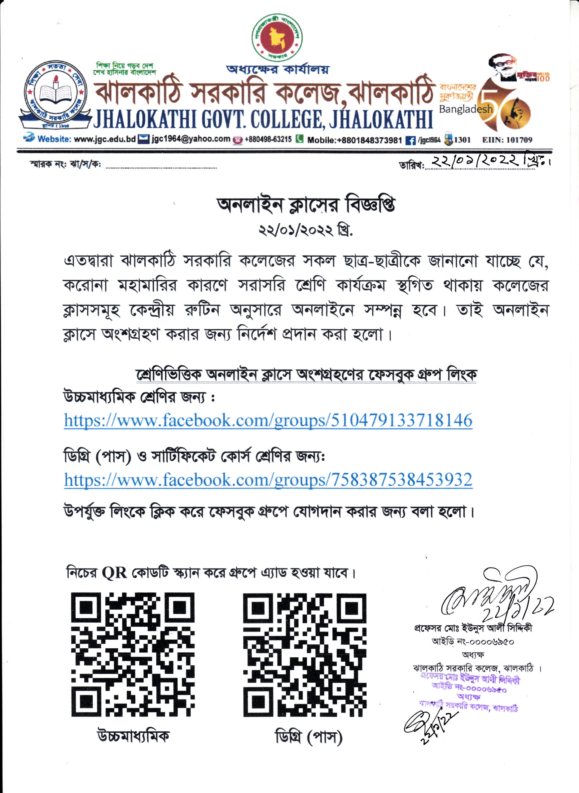 উচ্চমাধ্যমিক শ্রেণি ও ডিগ্রি পাস শ্রেণির জন্য অনলাইন ক্লাসের নোটিশ প্রকাশিতঃ ২২ জানুয়ারী , ২০২২, ২:১৯ অপরাহ্ন Facebook Twitter Print Facebook Twitter Print