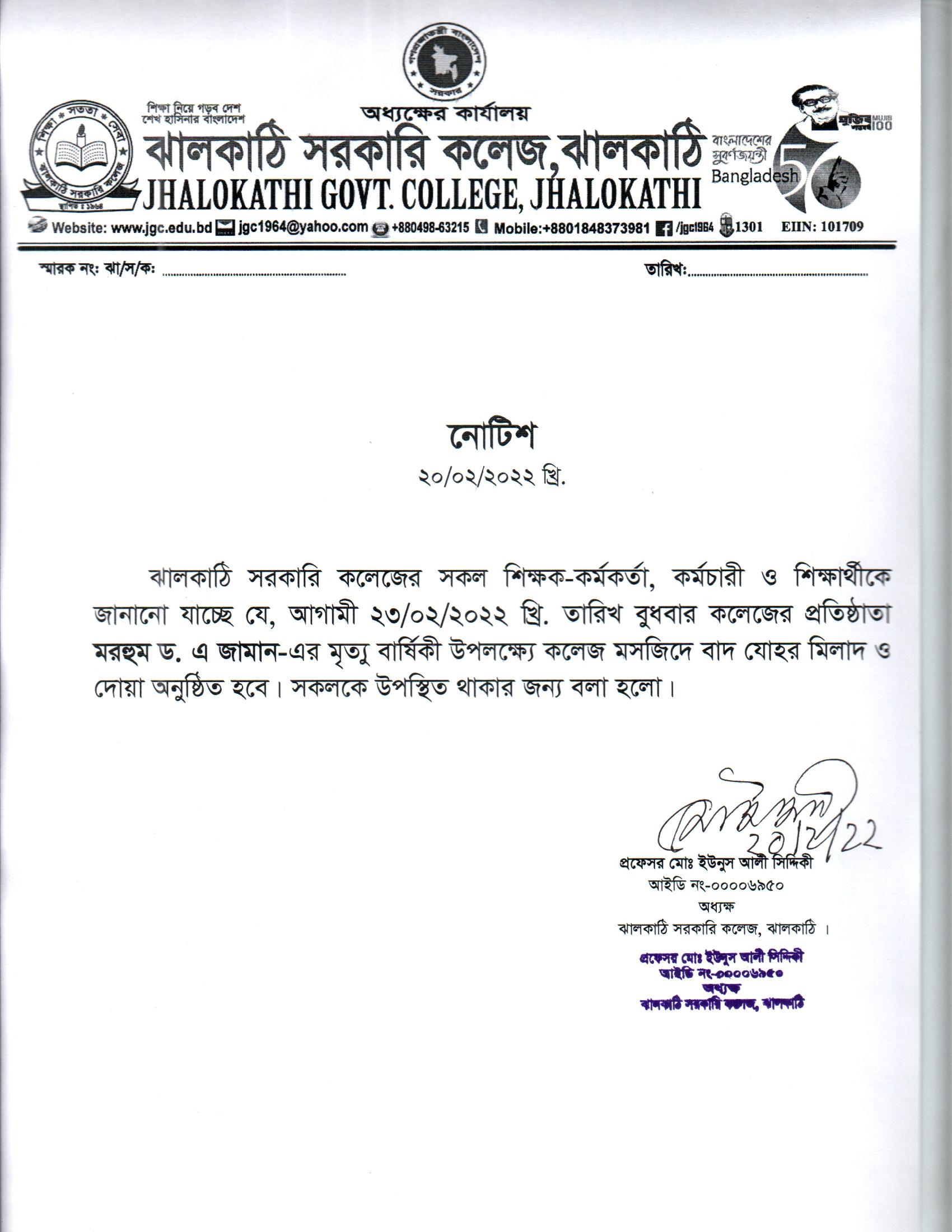 ঝালকাঠি সরকারি কলেজের প্রতিষ্ঠাতা মরহুম ড. জামান এর মৃত্যু বার্ষিকী উপলক্ষে মিলাদ অনুষ্ঠান উদযাপন প্রকাশিতঃ ২২ ফেব্রুয়ারী , ২০২২, ৪:২৯ অপরাহ্ন Facebook Twitter Print Facebook Twitter Print