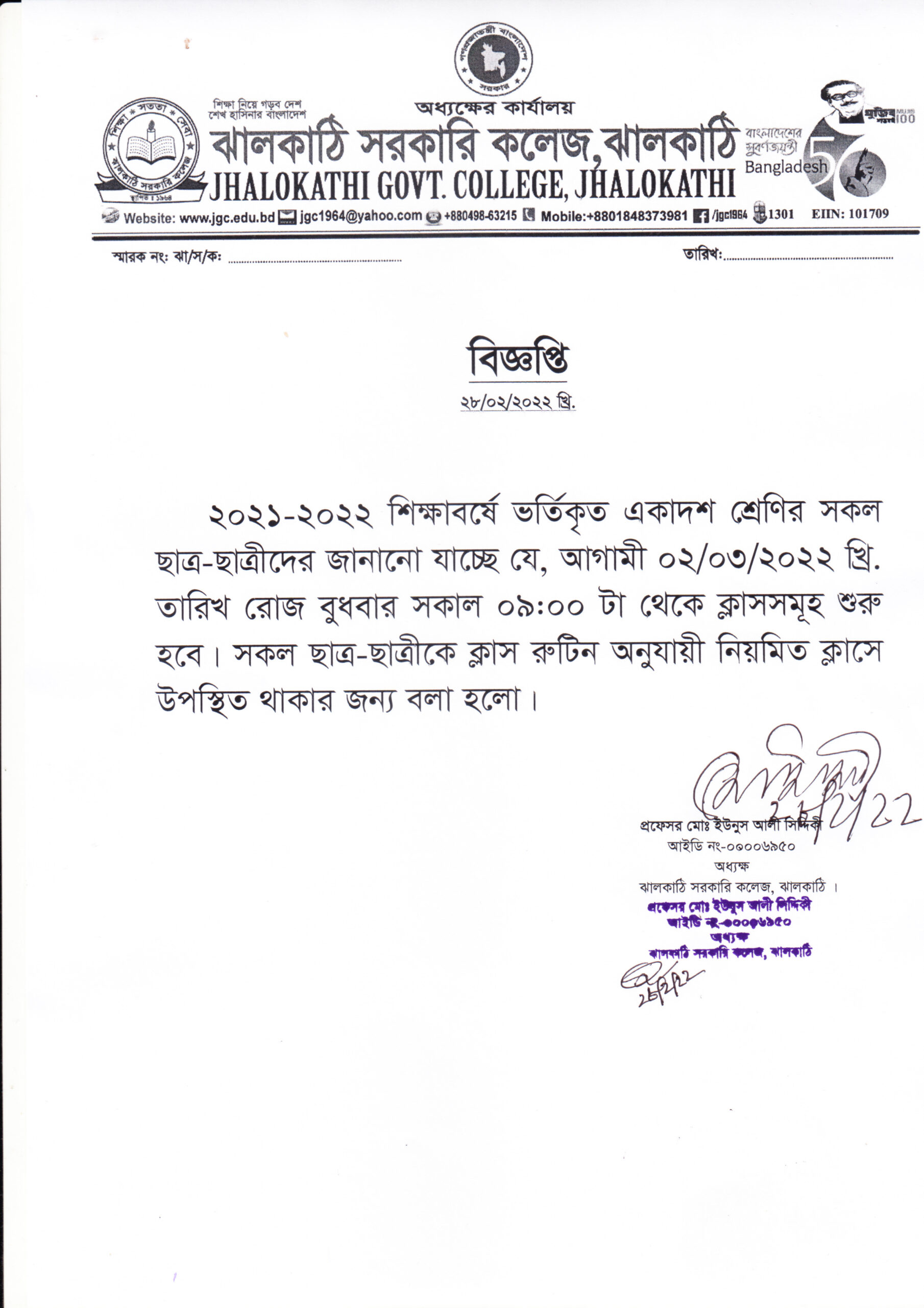 ২০২১-২০২২ শিক্ষাবর্ষে একাদশ শ্রেণির শিক্ষার্থীদের ক্লাস শুরুর নোটিশ প্রকাশিতঃ ২৮ ফেব্রুয়ারী , ২০২২, ১২:০৫ অপরাহ্ন Facebook Twitter Print Facebook Twitter Print