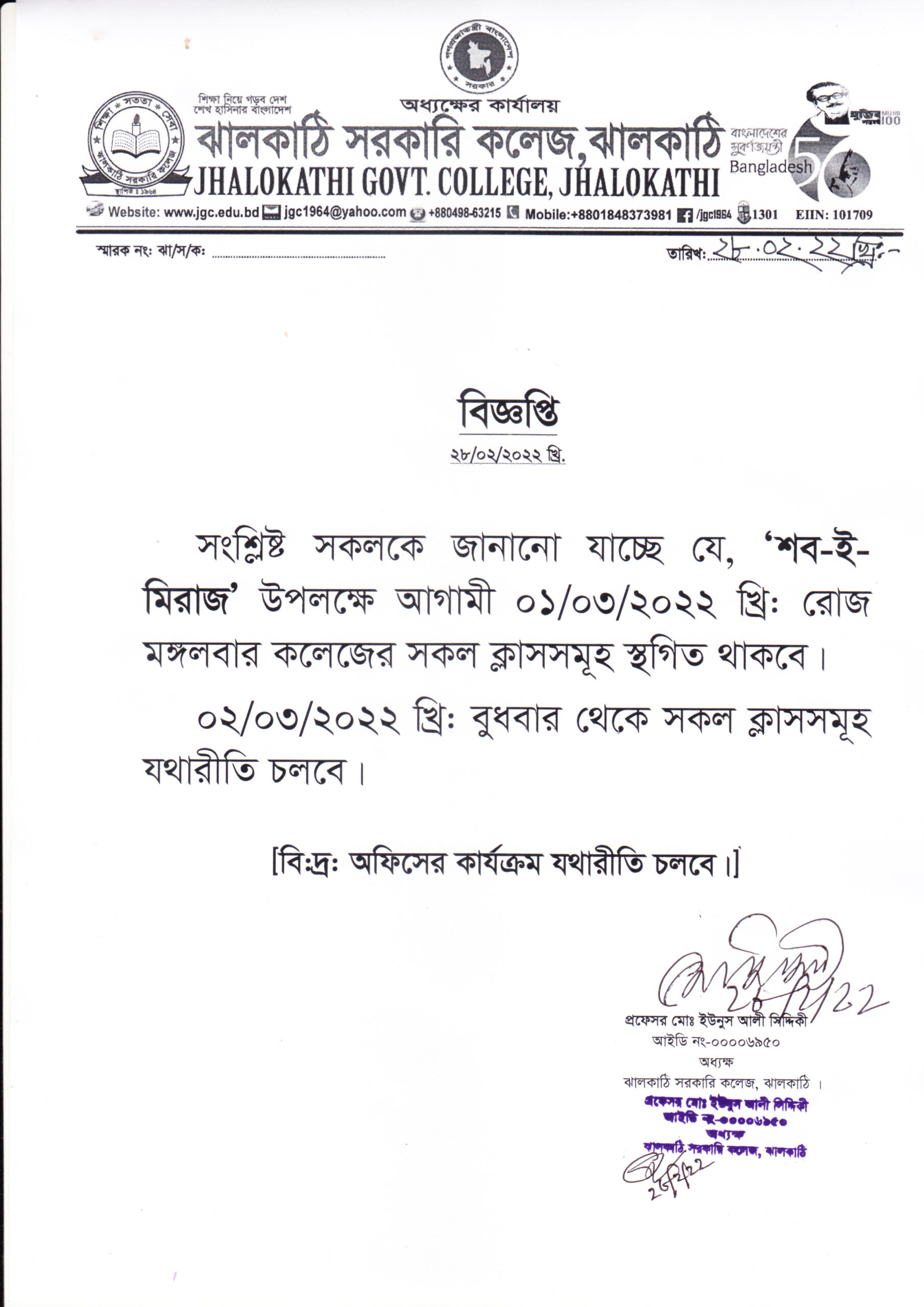 শব-ই-মিরাজ উপলক্ষে কলেজের ক্লাসসমূহ স্থগিত থাকার নোটিশ প্রকাশিতঃ ২৮ ফেব্রুয়ারী , ২০২২, ১২:২৬ অপরাহ্ন Facebook Twitter Print Facebook Twitter Print