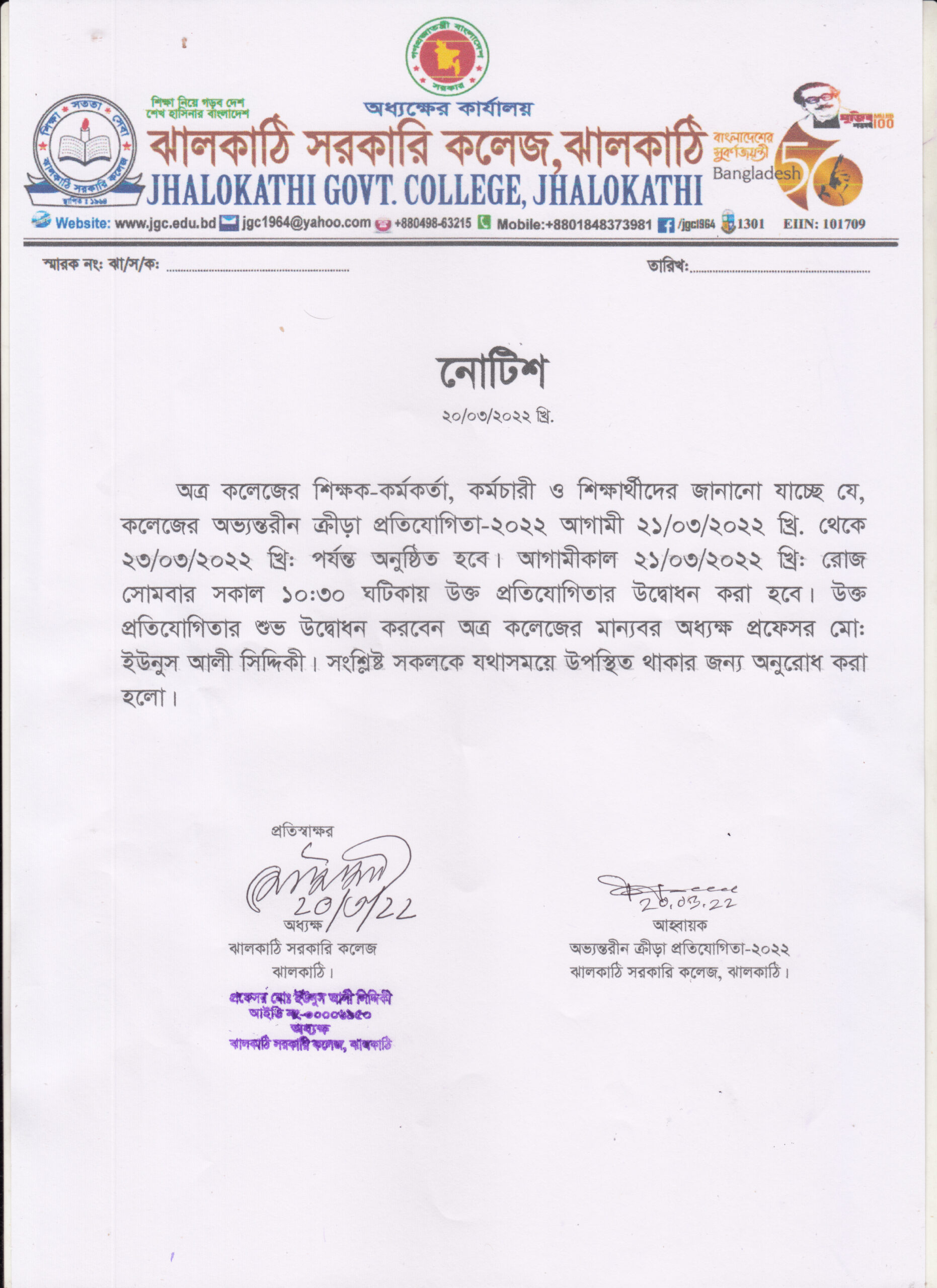 অভ্যন্তরীণ ক্রীড়া প্রতিযোগিতা উদ্ভোধনী নোটিশ -২০২২ প্রকাশিতঃ ২০ মার্চ , ২০২২, ৩:০৮ অপরাহ্ন Facebook Twitter Print Facebook Twitter Print