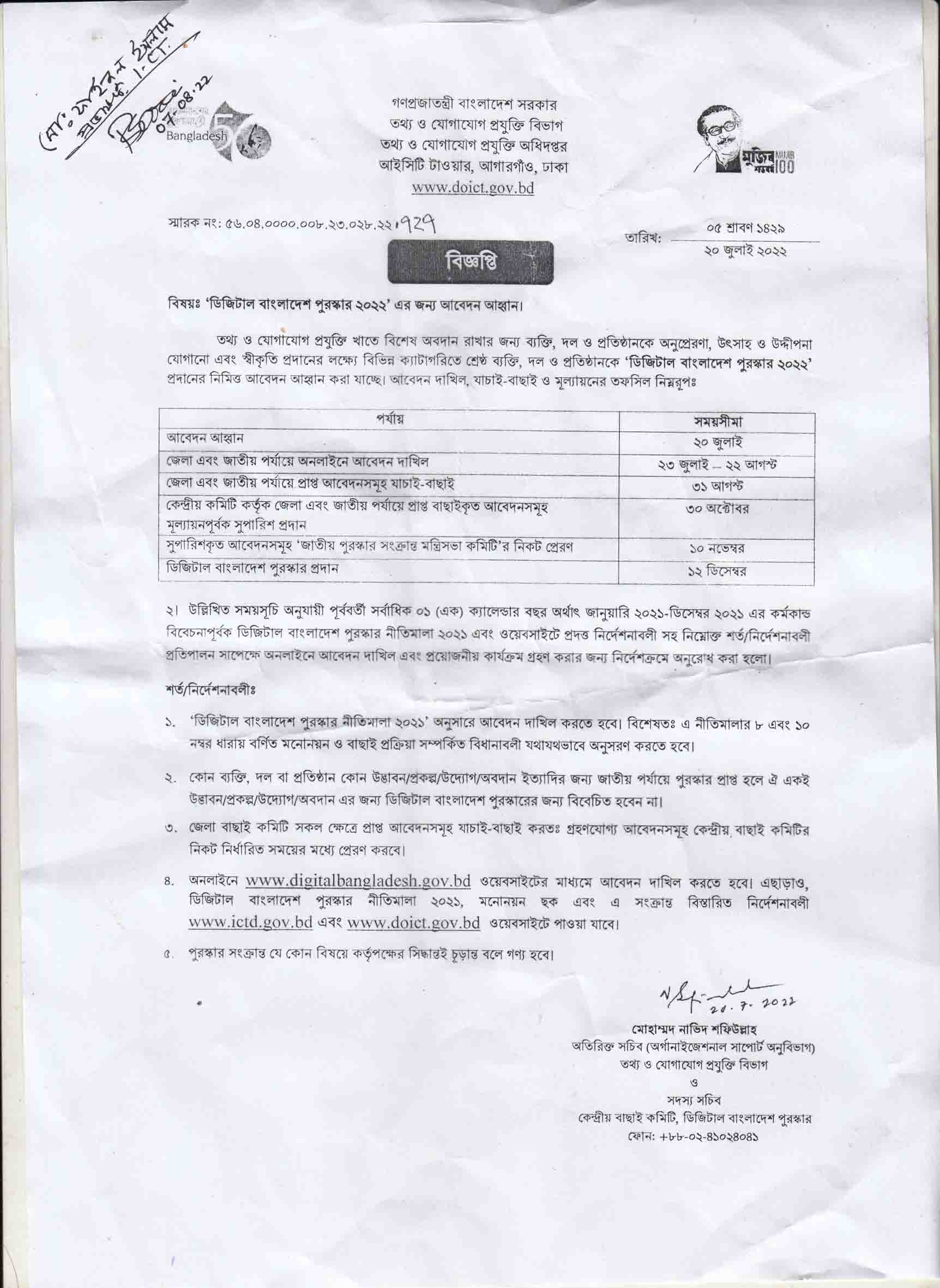 ‘ডিজিটাল বাংলাদেশ পুরষ্কার ২০২২’ জন্য আবেদন আহ্বান। প্রকাশিতঃ ৭ অগাস্ট , ২০২২, ১:২৫ অপরাহ্ন Facebook Twitter Print Facebook Twitter Print