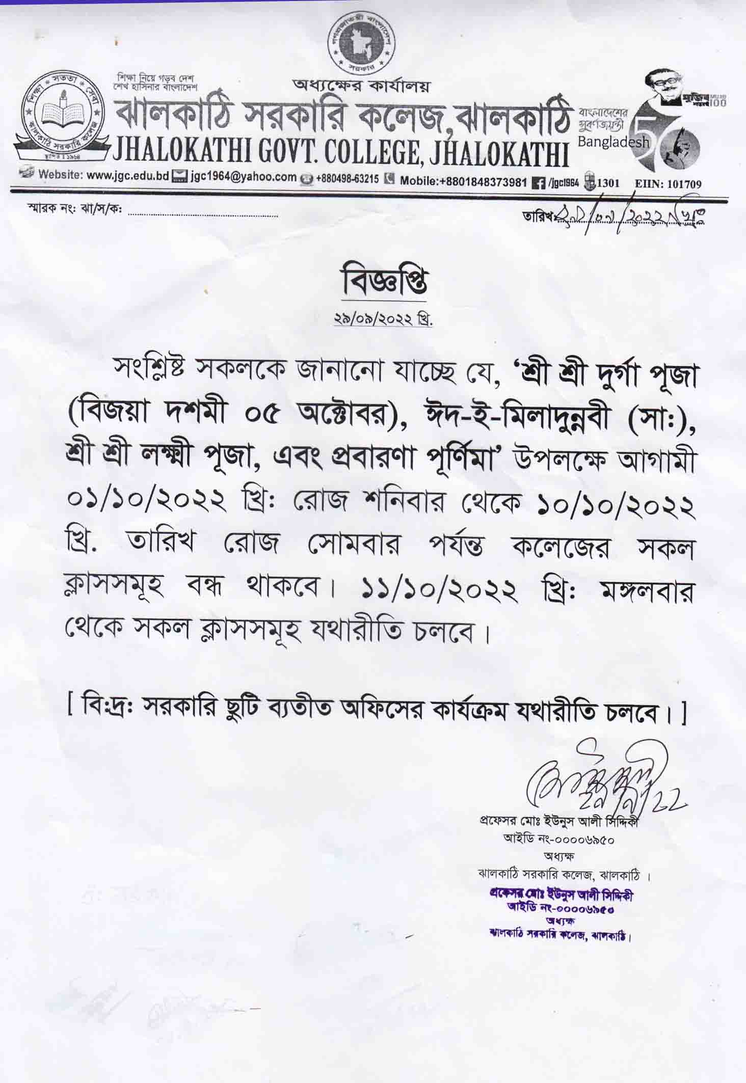 ০১ অক্টোবর থেকে ১০ অক্টোবর ২০২২ সকল ক্লাসসমূহ বন্ধ থাকার নোটিশ প্রকাশিতঃ ২৯ সেপ্টেম্বর , ২০২২, ২:২৮ অপরাহ্ন Facebook Twitter Print Facebook Twitter Print