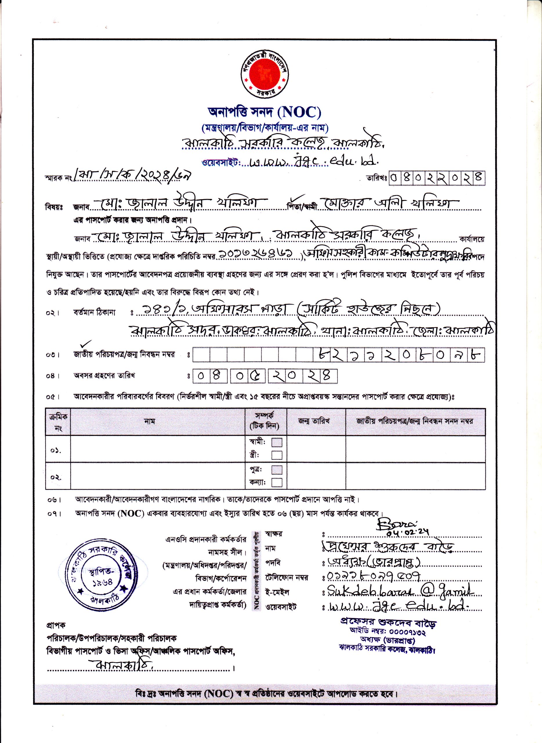 জনাব মো: জালাল উদ্দিন খলিফা, অফিস সহকারী কাম-কম্পিউটার মুদ্রাক্ষরিক এর পাসপোর্ট অনাপত্তি সনদ। প্রকাশিতঃ ৫ ফেব্রুয়ারী , ২০২৪, ৩:৪৭ অপরাহ্ন Facebook Twitter Print Facebook Twitter Print
