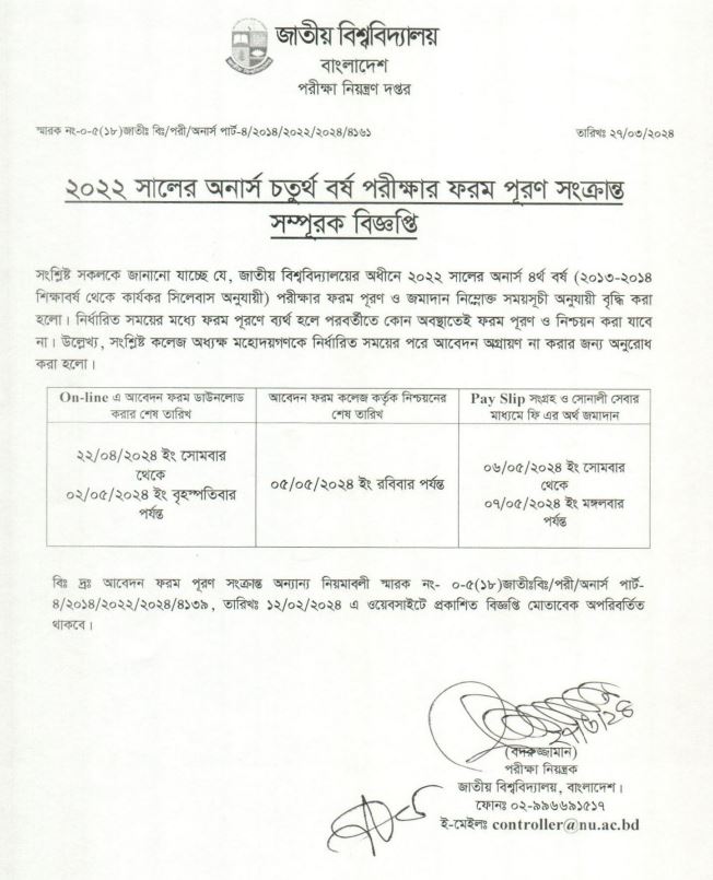 ২০২২ সালের অনার্স ৪র্থ বর্ষ পরীক্ষার ফরমপূরণ এর সময় বৃদ্ধি সংক্রান্ত নোটিশ। প্রকাশিতঃ ২৮ মার্চ , ২০২৪, ১:১৩ অপরাহ্ন Facebook Twitter Print Facebook Twitter Print
