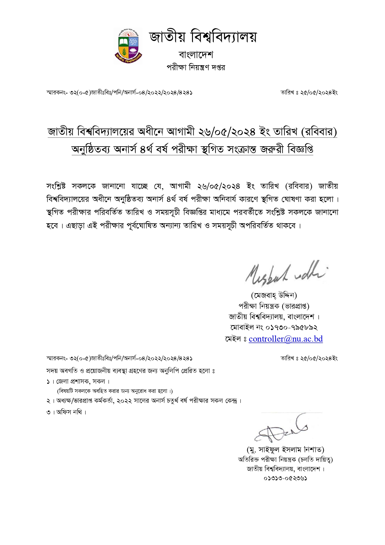 আগামী ২৬/০৫/২০২৪ খ্রি. তারিখ রবিবার এর অনুষ্ঠিতব্য অনার্স ৪র্থ বর্ষ পরীক্ষা স্থগিত। পরবর্তী দিনের পরীক্ষাসমূহ পূর্বের রুটিন অনুযায়ী যথাসময়ে অনুষ্ঠিত হবে। উল্লেখ্য, ২৬/৫/২৪ খ্রি. রবিবারের স্থগিত পরীক্ষার তারিখ পরবর্তীতে জাতীয় বিশ্ববিদ্যালয়ের ওয়েবসাইটে জানানো হবে।