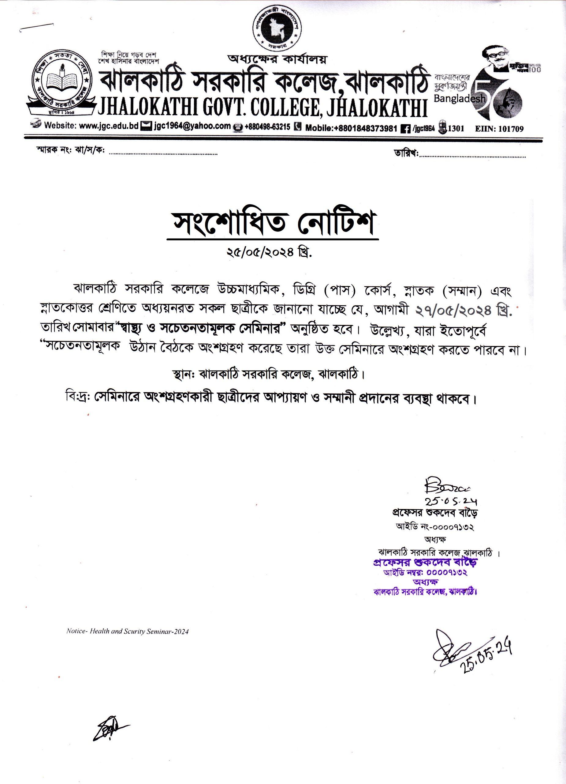 ‘‘স্বাস্থ্য ও সচেতনতামূলক সেমিনার’’ আগামী ২৭/৫/২৪ খ্রি. সোমবার অনুষ্ঠিত হবে। প্রকাশিতঃ ২৫ মে , ২০২৪, ১১:৫৪ অপরাহ্ন Facebook Twitter Print Facebook Twitter Print