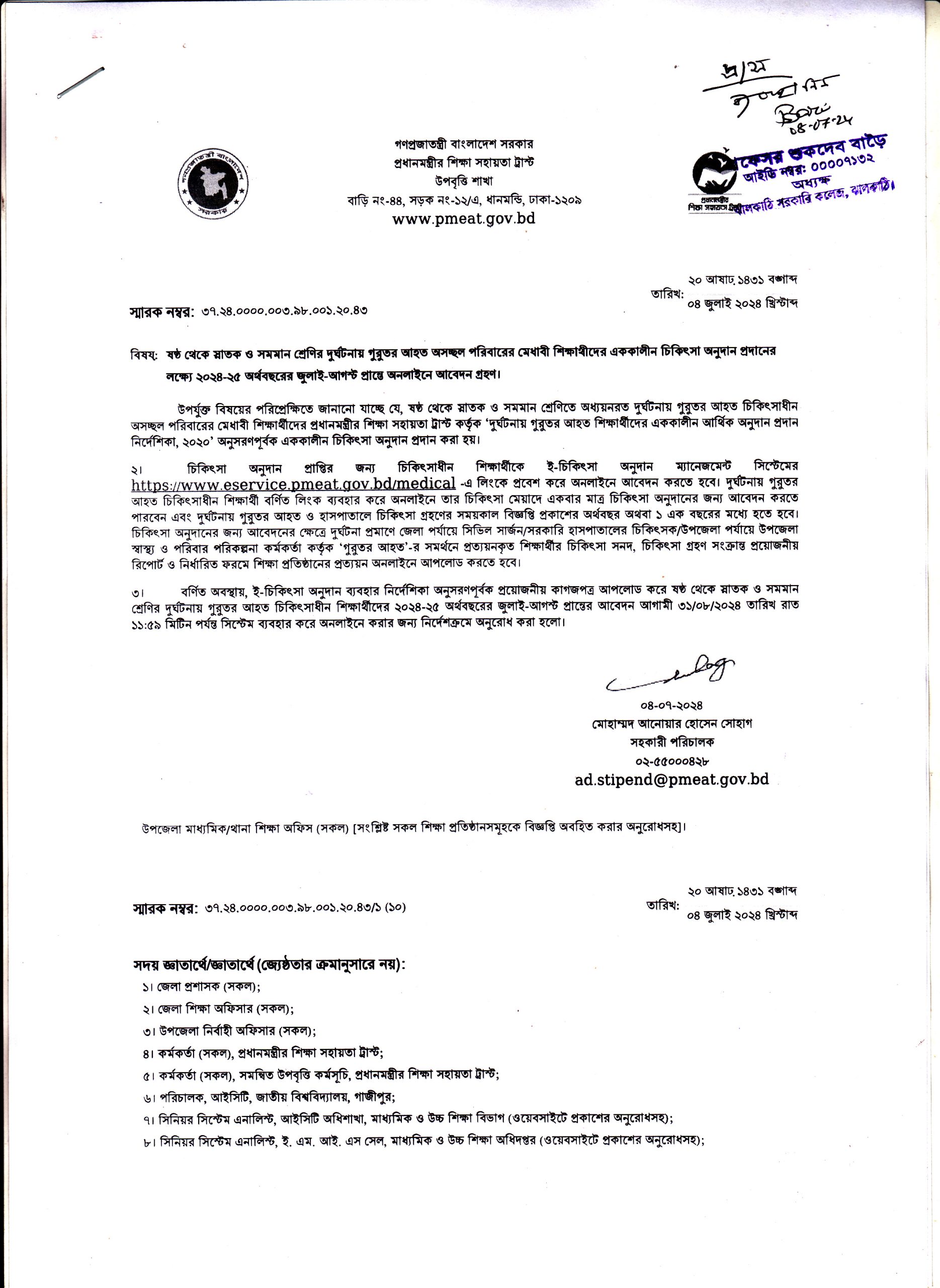 ঝালকাঠি সরকারি কলেজের অধ্যয়রত দুর্ঘটনায় গুরুতর আহত অসচ্ছল পরিবারের মেধাবী শিক্ষার্থীদের এককালী চিকিৎসা অনুদান প্রদানের নোটিশ। প্রকাশিতঃ ৮ জুলাই , ২০২৪, ১১:৪৮ পূর্বাহ্ন Facebook Twitter Print Facebook Twitter Print