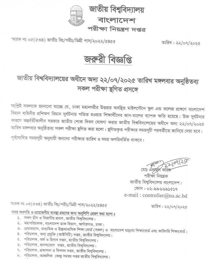 জাতীয় বিশ্ববিদ্যালয়ের অধীনে ২২/০৭/২০২৫ খ্রি. তারিখ মঙ্গলবার অনুষ্ঠিতব্য সকল পরীক্ষা স্থগিত। প্রকাশিতঃ ২২ জুলাই , ২০২৫, ১০:৩১ পূর্বাহ্ন Facebook Twitter Print notice_5455_pub_date_22072025 Facebook Twitter Print