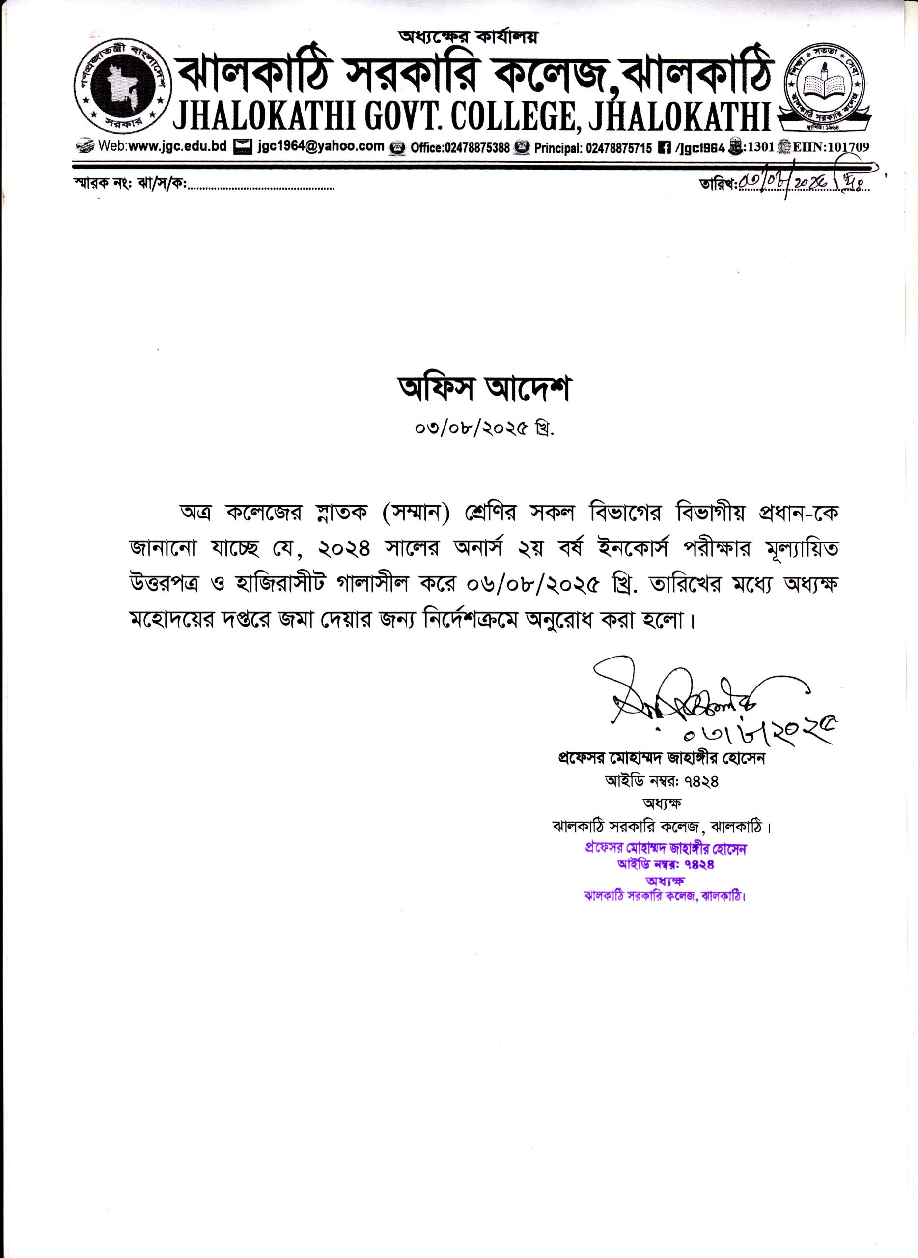 ২০২৪ সালের অনার্স ২য় বর্ষ পরীক্ষার ইনকোর্স ও হাজিরাশীট গালসীল করে জমা প্রসঙ্গে। প্রকাশিতঃ ৩ অগাস্ট , ২০২৫, ১২:৫৮ অপরাহ্ন Facebook Twitter Print Facebook Twitter Print