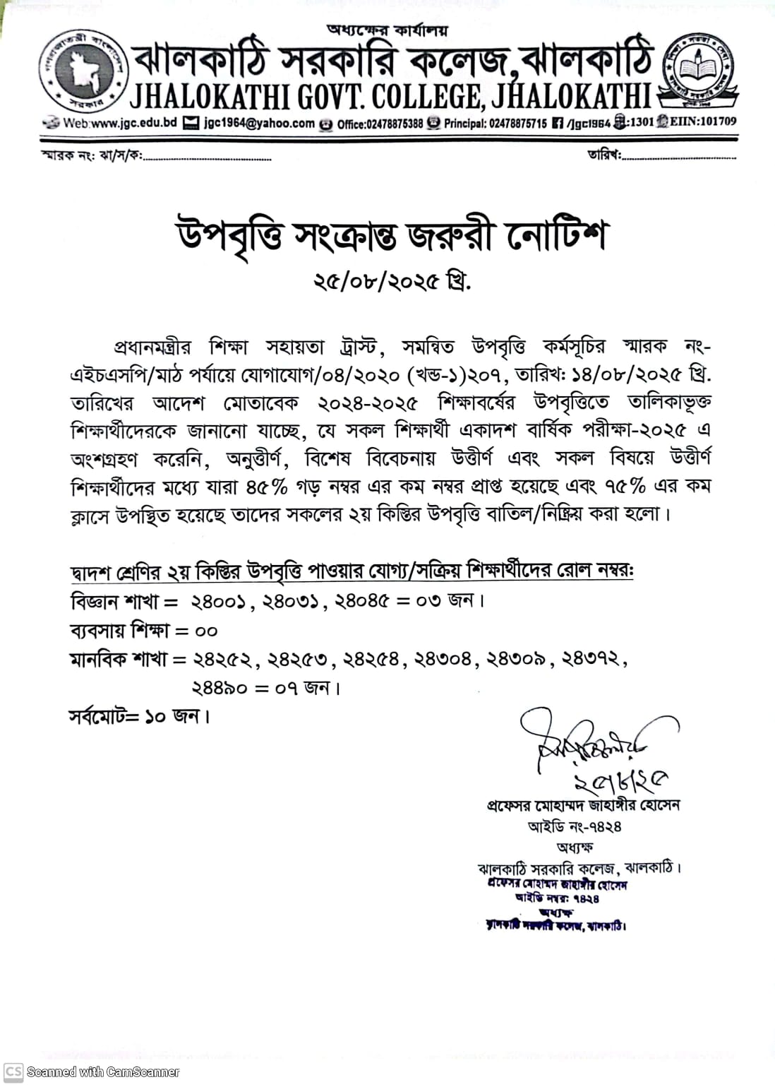 ২০২৪-২০২৫ শিক্ষাবর্ষের দ্বাদশ শ্রেণির উপবৃত্তি নিষ্কিয়করণ সংক্রান্ত নোটিশ প্রকাশিতঃ ২৫ অগাস্ট , ২০২৫, ১২:০৩ অপরাহ্ন Facebook Twitter Print Facebook Twitter Print